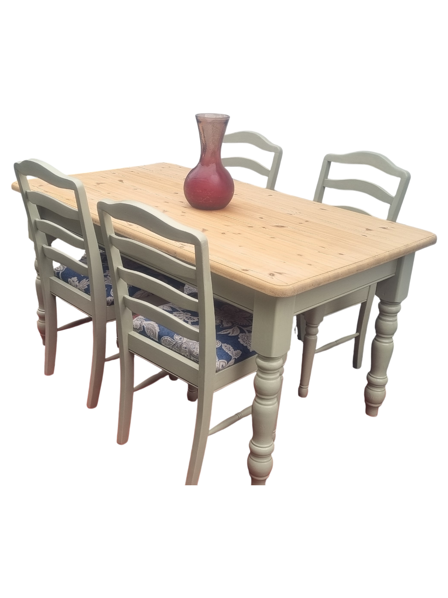 The set includes four matching ladder-back chairs, each painted to match and fitted with brand-new upholstered seats for comfort and style.