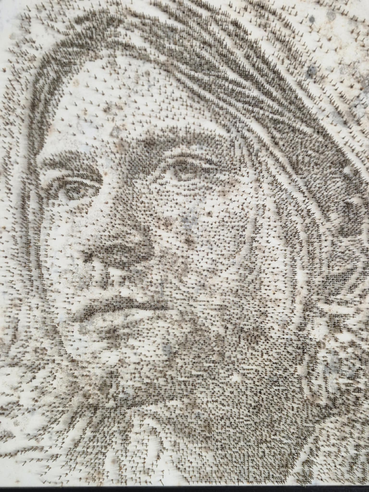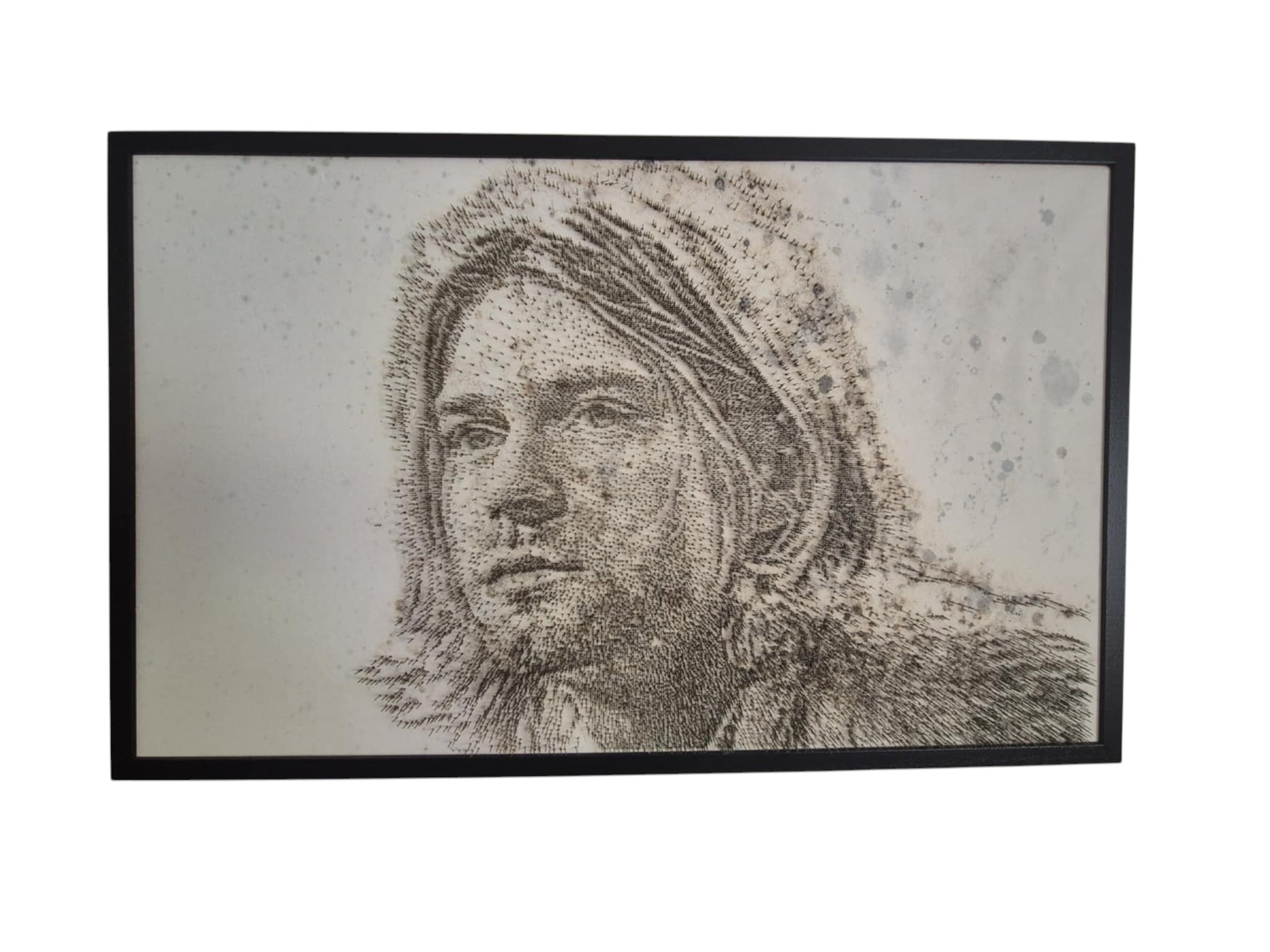 From a distance, the piece evokes the quiet intensity of a fine sketch; up close, it reveals an intricate tapestry of metallic detail, each pin a deliberate mark of artistry. This unique technique transforms raw industrial material into a timeless tribute, capturing both the fragility and power of Nirvana’s legendary frontman.