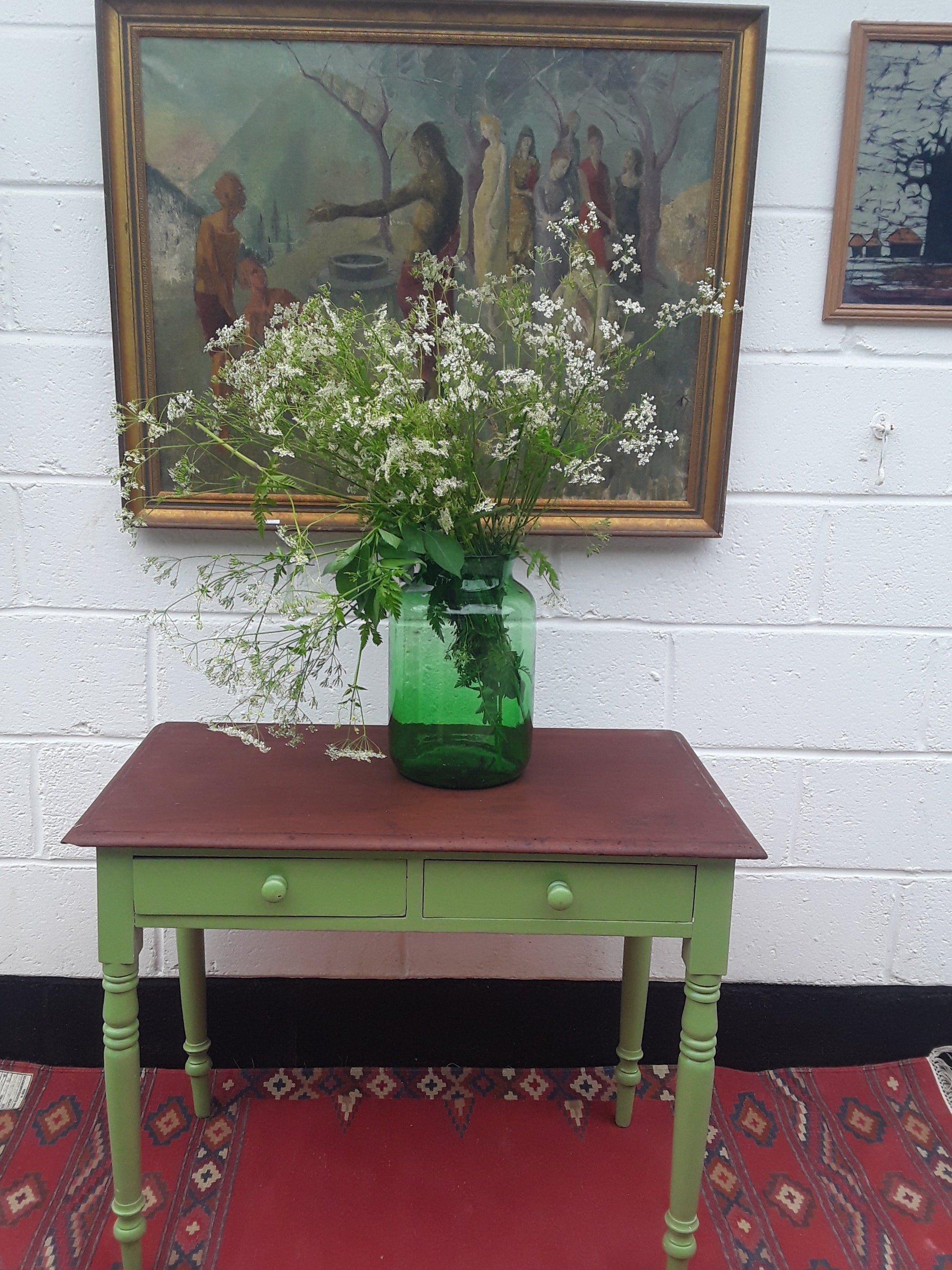 A charming Victorian mahogany console or side table, later painted in a fresh green tone with contrasting mahogany top. The table stands on elegant turned legs and features two drawers, offering both decorative appeal and practical storage.