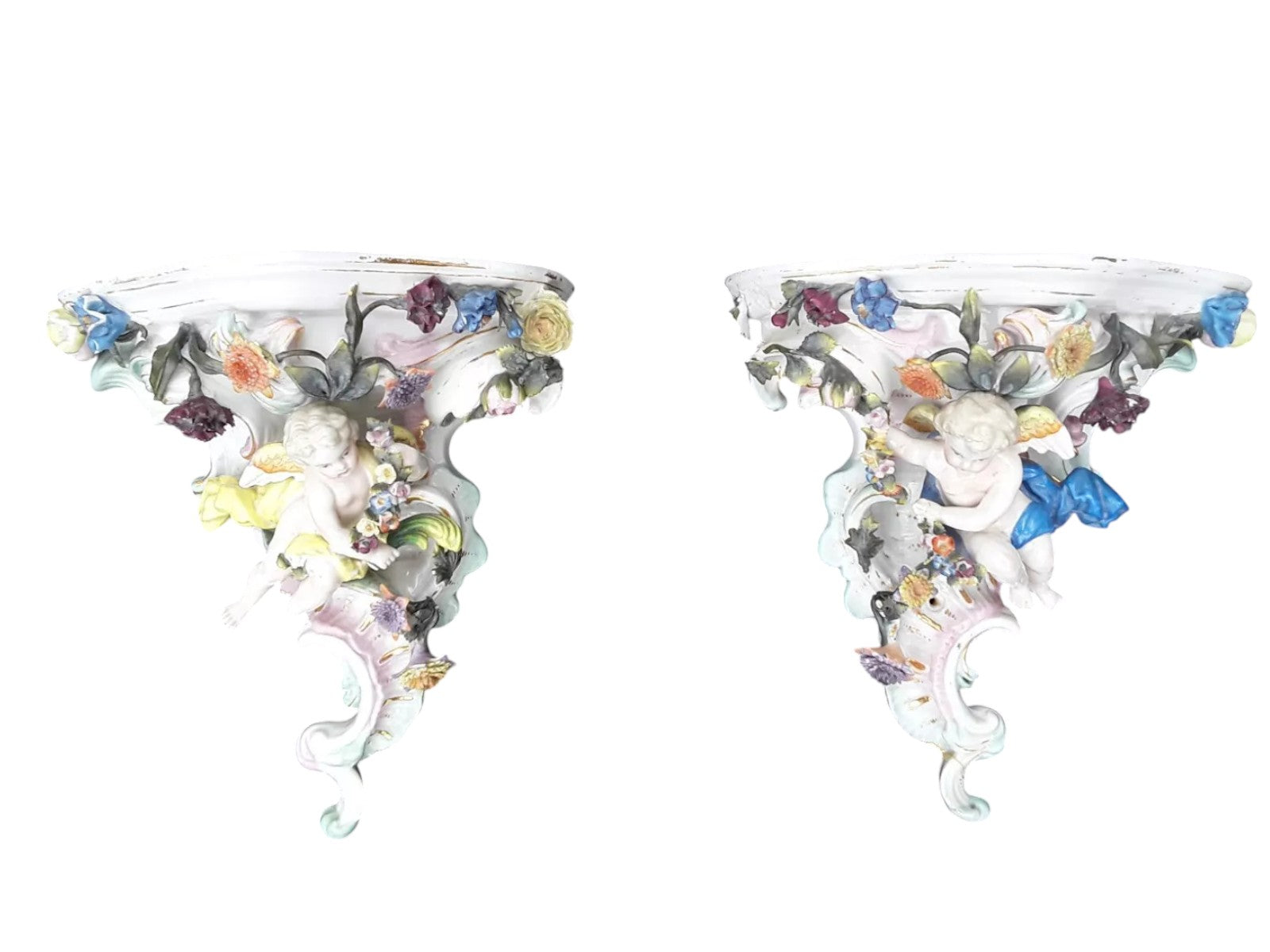 A beautiful pair of Dresden porcelain wall brackets, richly decorated in the Rococo style. Each bracket is adorned with a finely modeled cherub figure surrounded by intricate encrusted flowers, painted in soft pastel tones with gilded highlights.