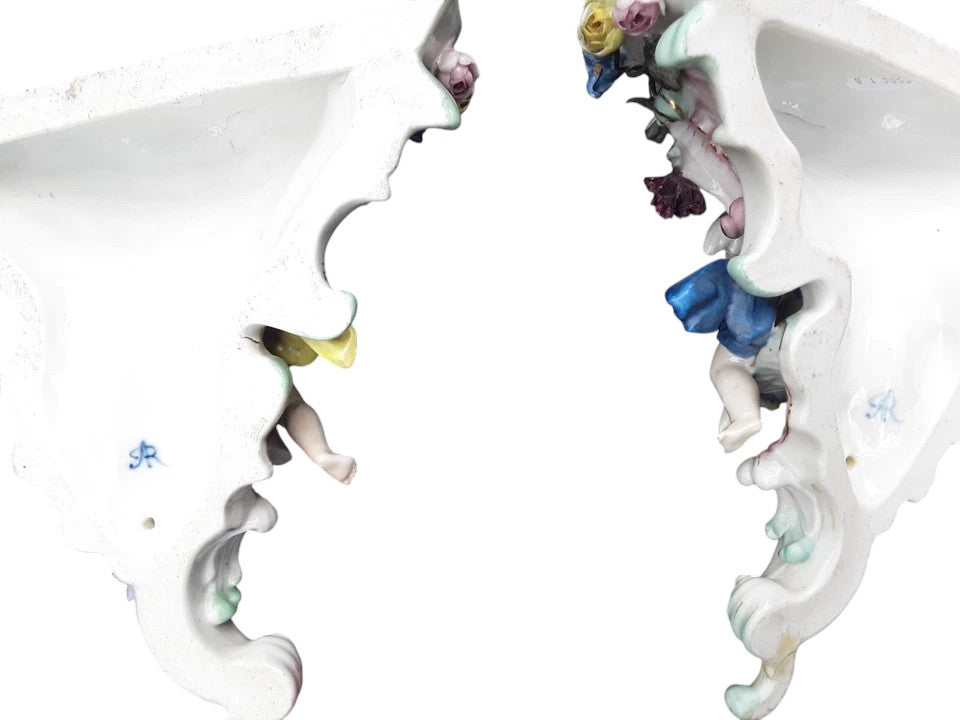 Pair of Dresden Porcelain Wall Brackets with Cherubs & Floral Decoration – AR Mark